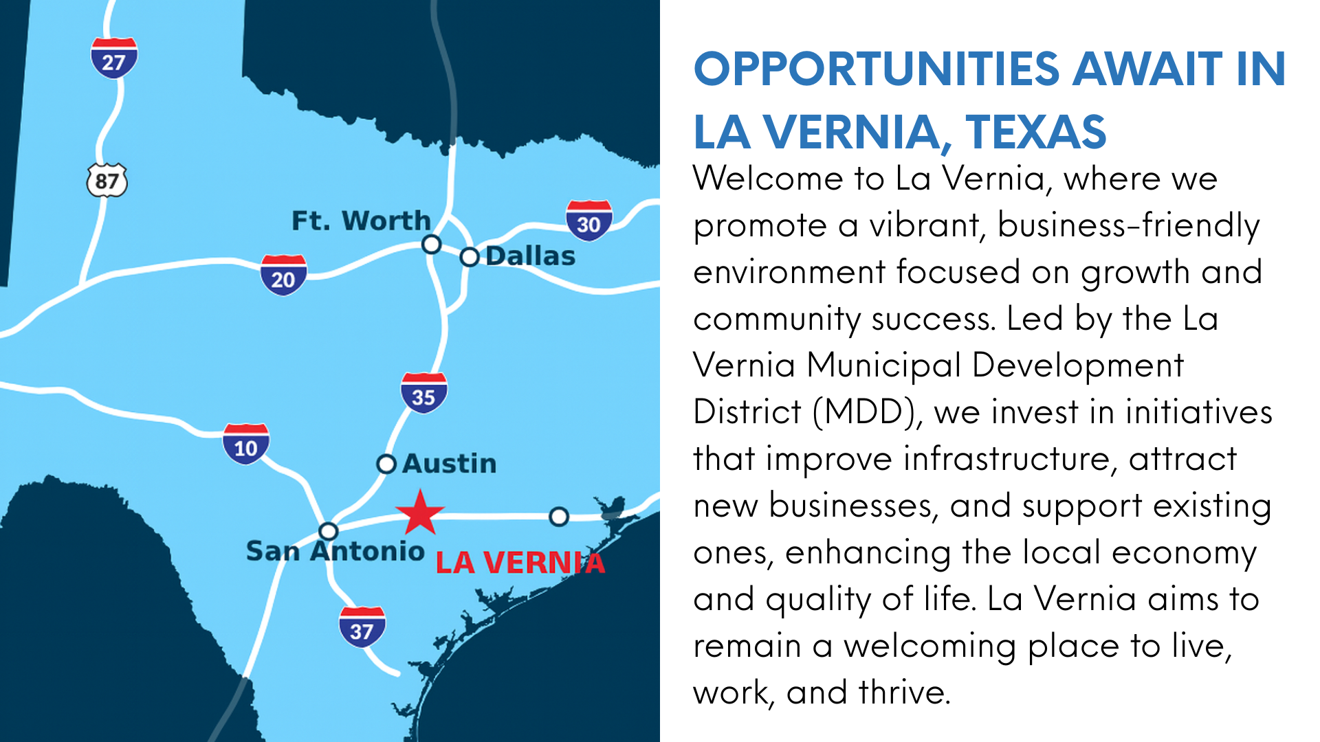 we are committed to fostering a vibrant, business-friendly environment that supports growth, innovation, and long-term community success. Through the leadership of the La Vernia Municipal Development District (MDD), we are actively investing in economic development initiatives that enhance local infrastructure, attract new businesses, and support existing ones. Our collaborative approach strengthens the local economy, improves quality of life, and ensures La Vernia remains a welcoming place to live, work, and thrive.